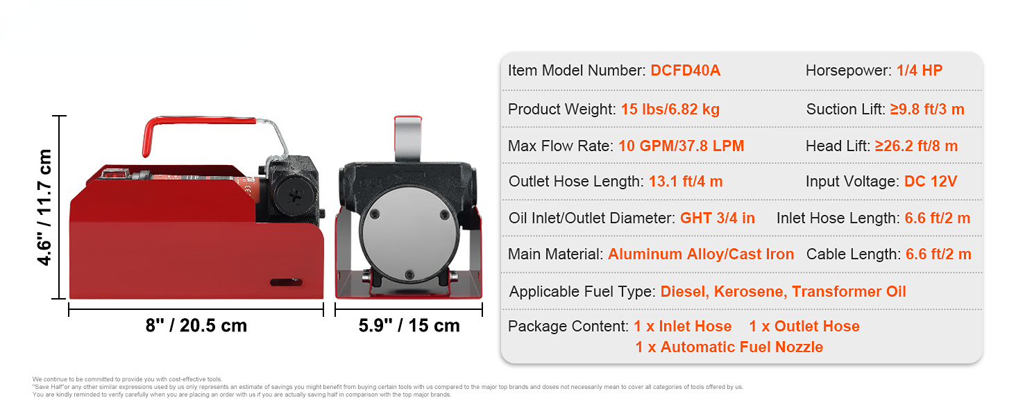 Tired of manual diesel transfer pumps? Refueling shouldn't feel like a workout! Check out VEVOR's fuel transfer extractor pump – just connect it to a 12V battery, and you're good to go. The automatic shut-off fuel nozzle takes care of everything and automatically stops when the tank is full. This diesel pump can be installed and used in various oil barrels, large horizontal oil tanks, pick-up truck reserve fuel tanks, and more. The automatic shut-off fuel nozzle makes our fuel transfer pump stand out in the market. You will get a more convenient fueling experience. This diesel fuel transfer pump has a 6.6 ft PVC inlet hose with a metal mesh filter at the end, keeping impurities out without the headache. Our self priming fuel pump is portable and easy to use. Simply connect it to a 12V battery and refuel your vehicles and machinery anytime, anywhere. About this item